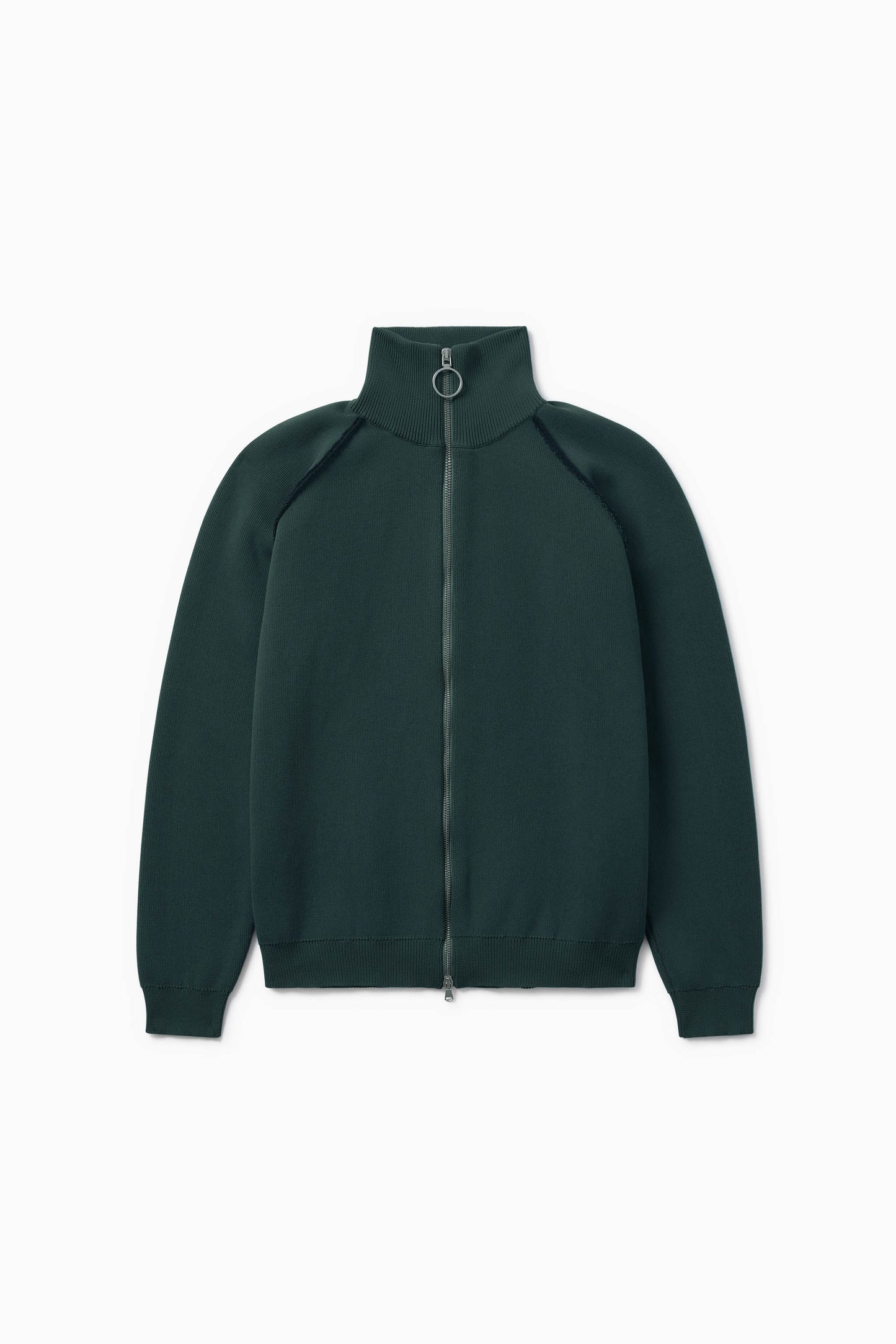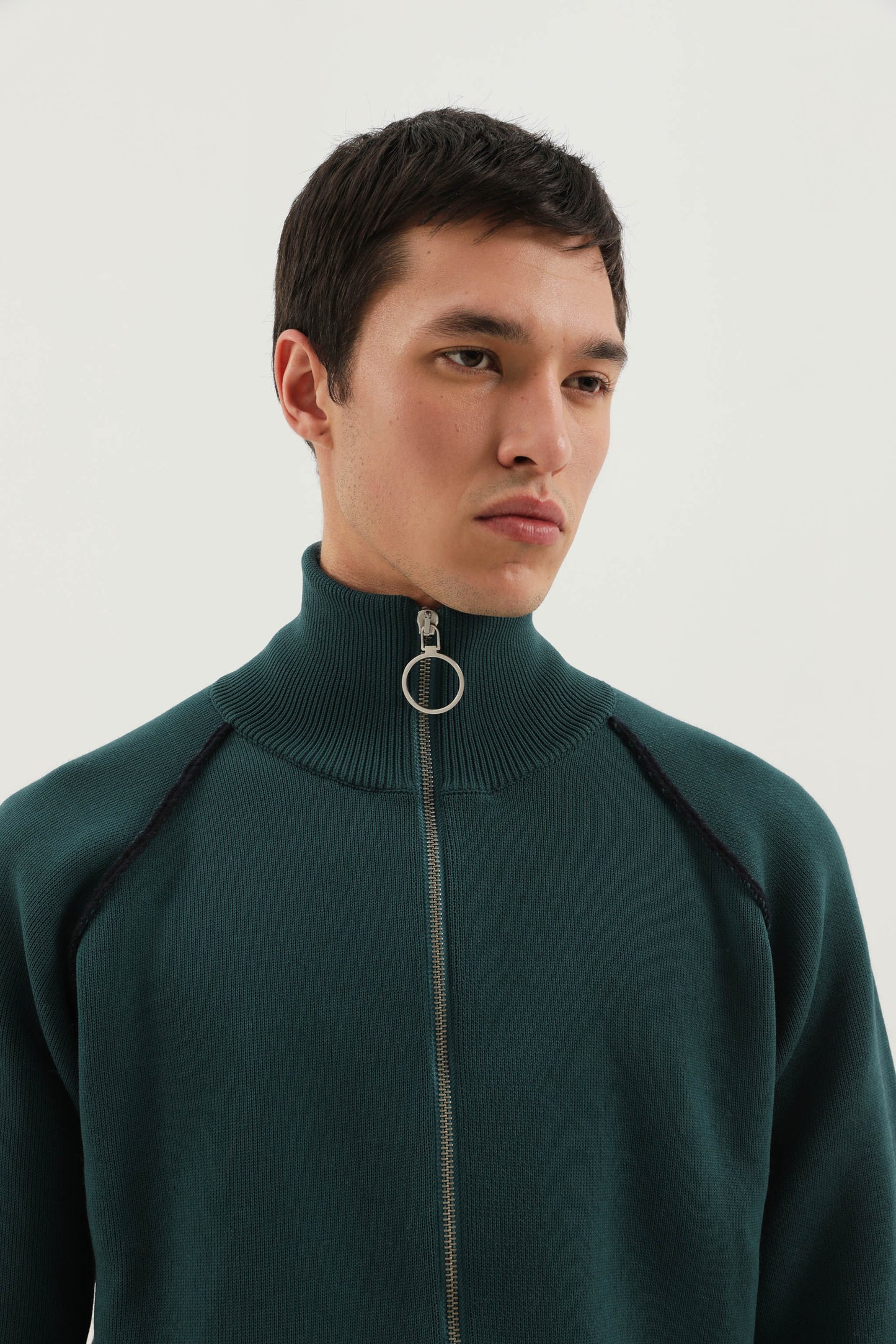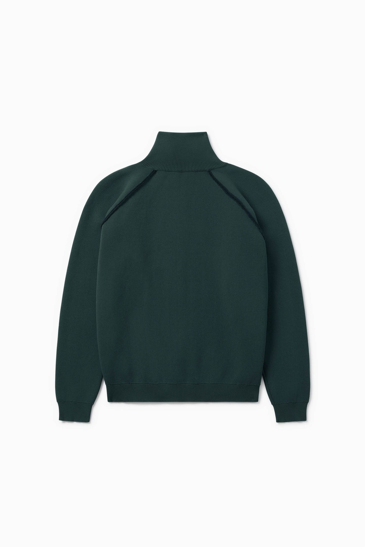 Sweater featuring ribbed knit, high neck, front zip fastening, raglan sleeves, ribbed cuffs and hem.