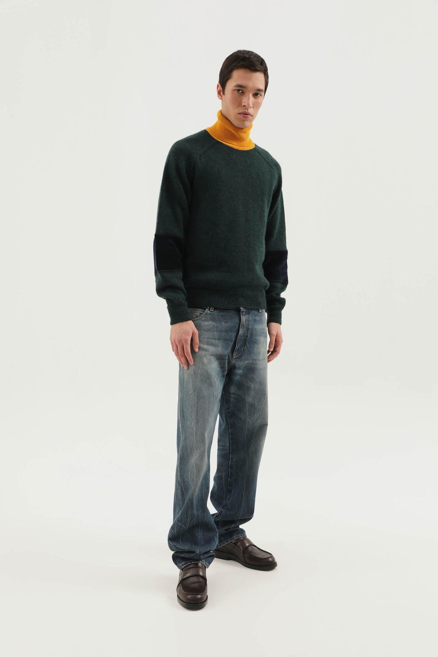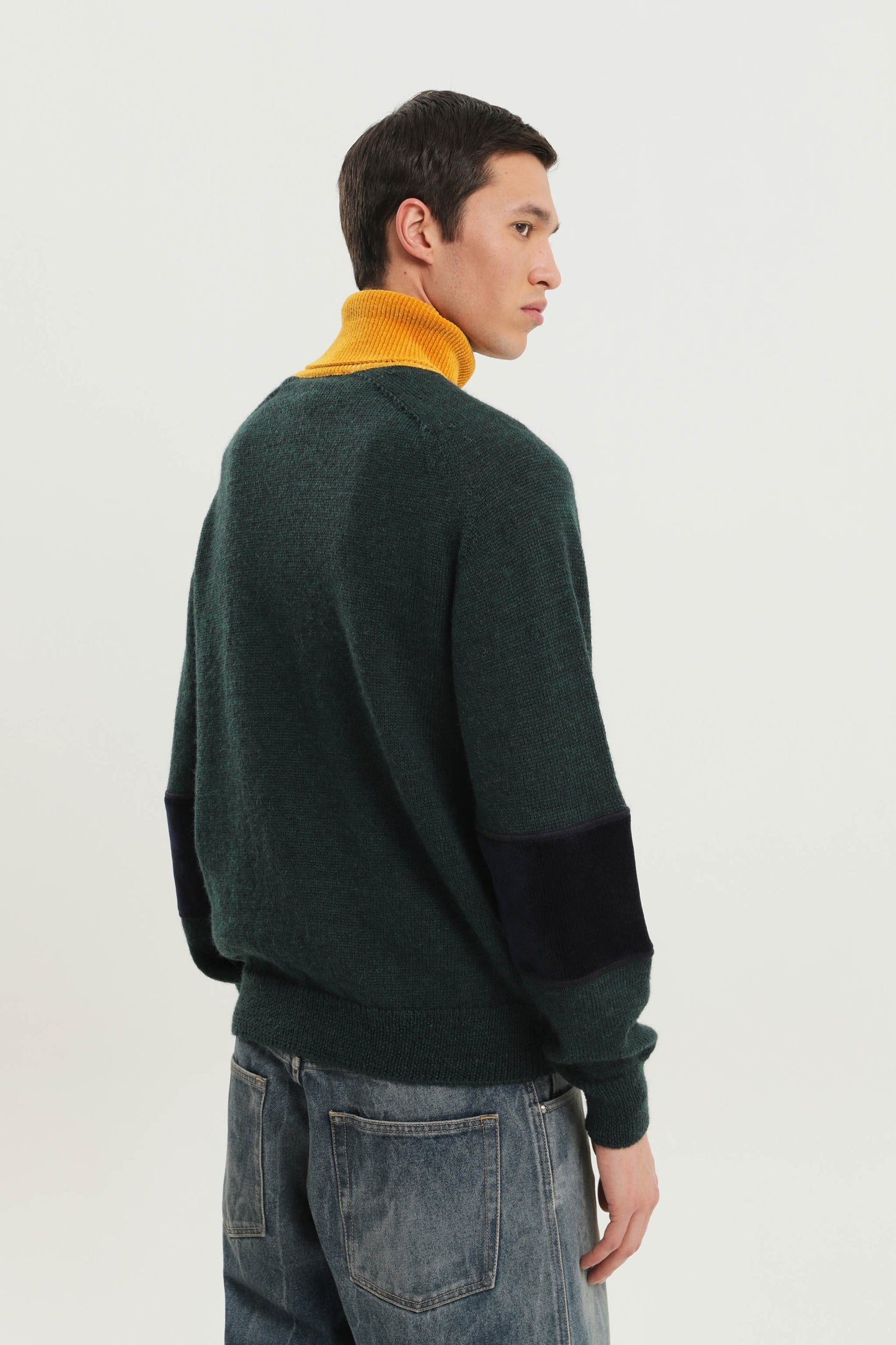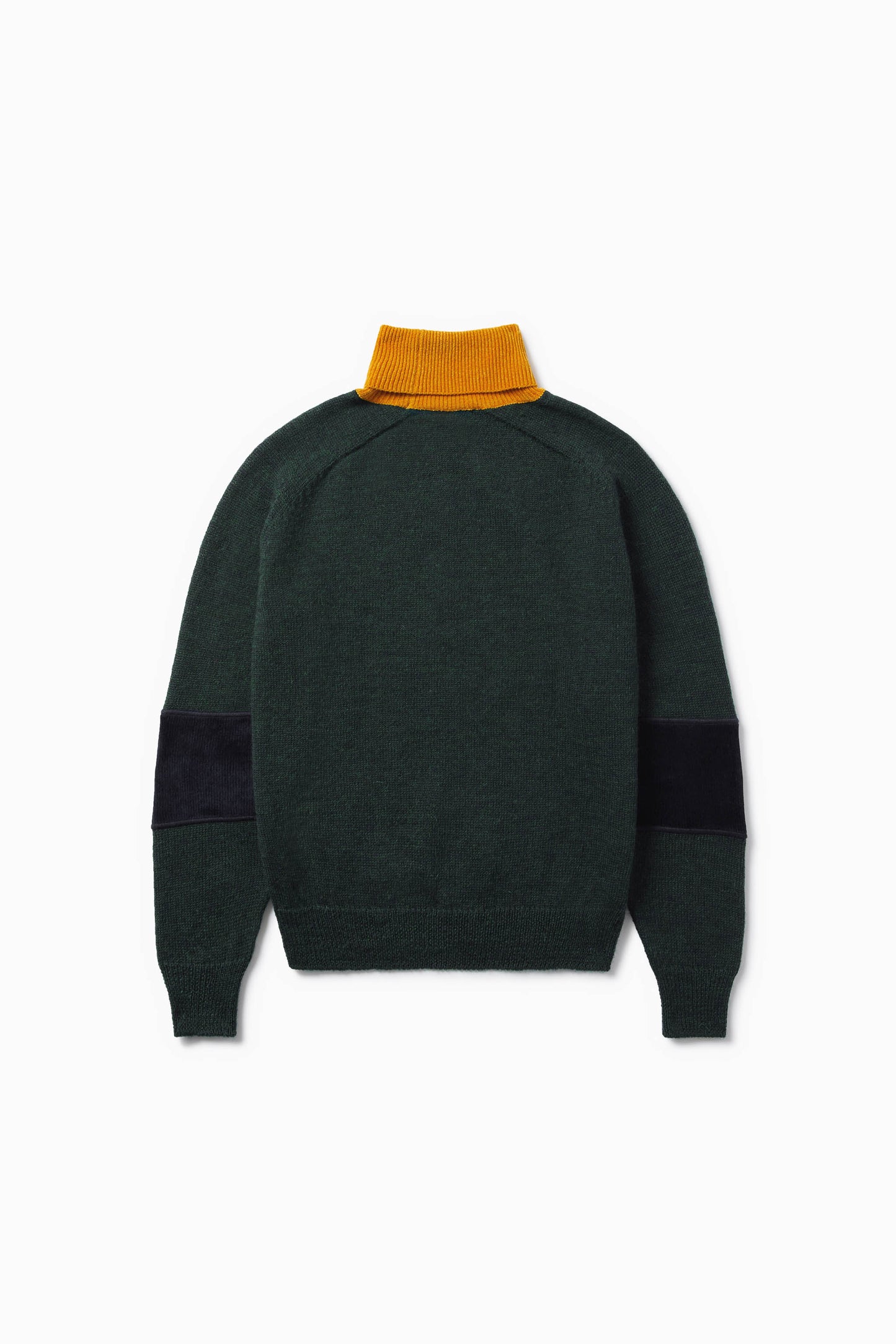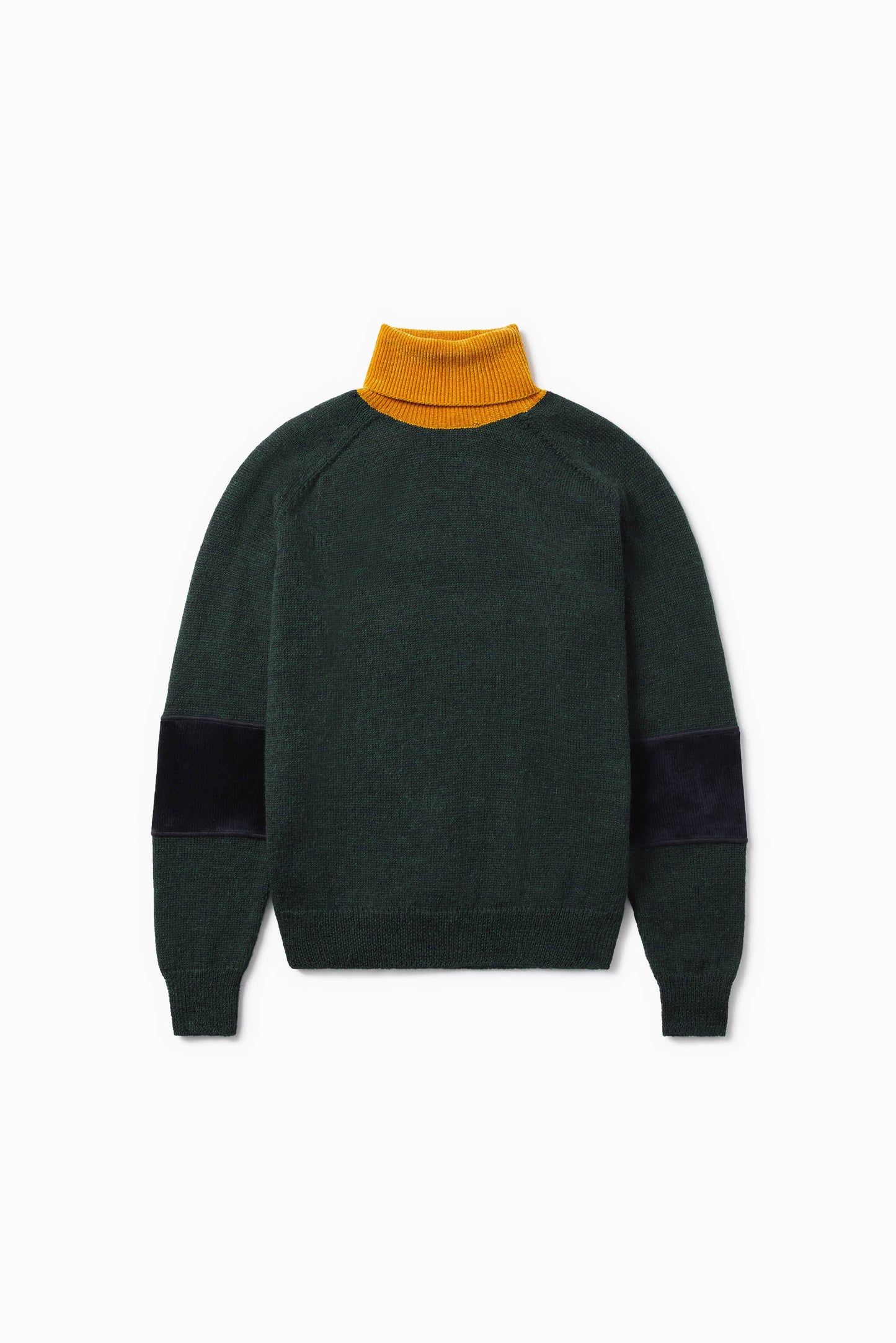 Bicolor wool pullover, featuring ochre ribbed chenille turtleneck, long sleeves with dark blue chenille patches, ribbed cuffs and hem.