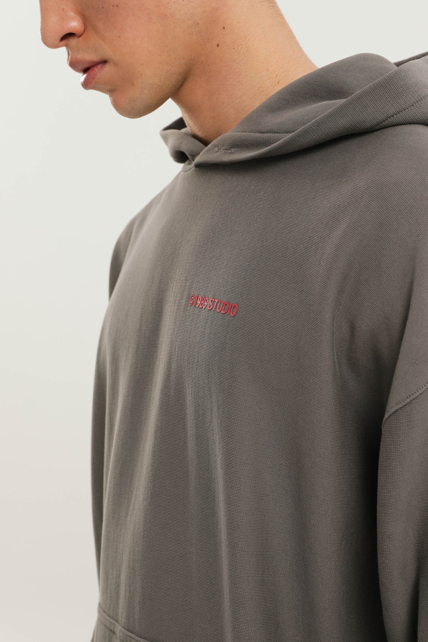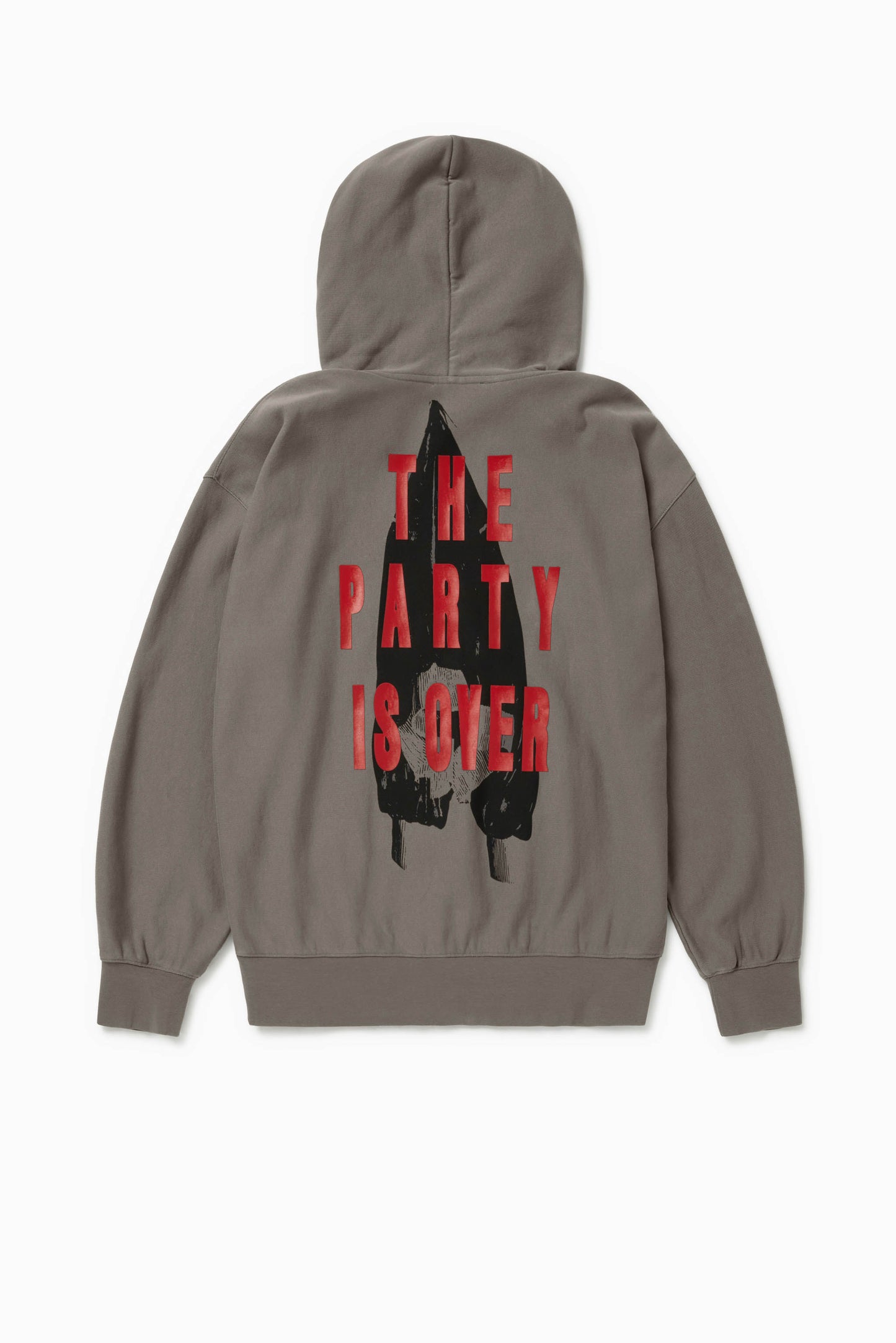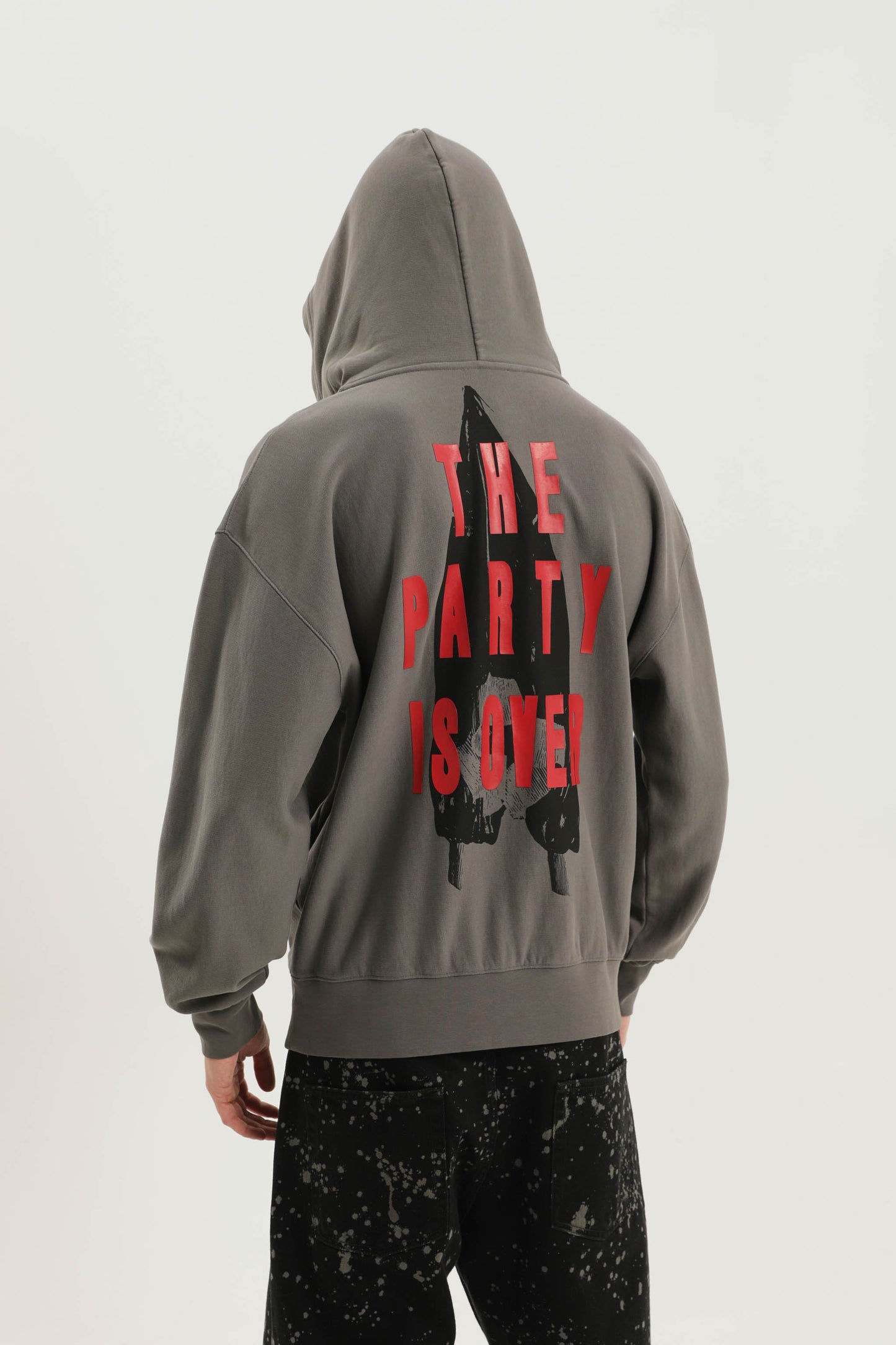 Sweatshirt hoodie featuring logo print on the chest, "The Party Is Over" print on the back, long sleeves, front kangaroo pocket and ribbed collar, cuffs and hem.