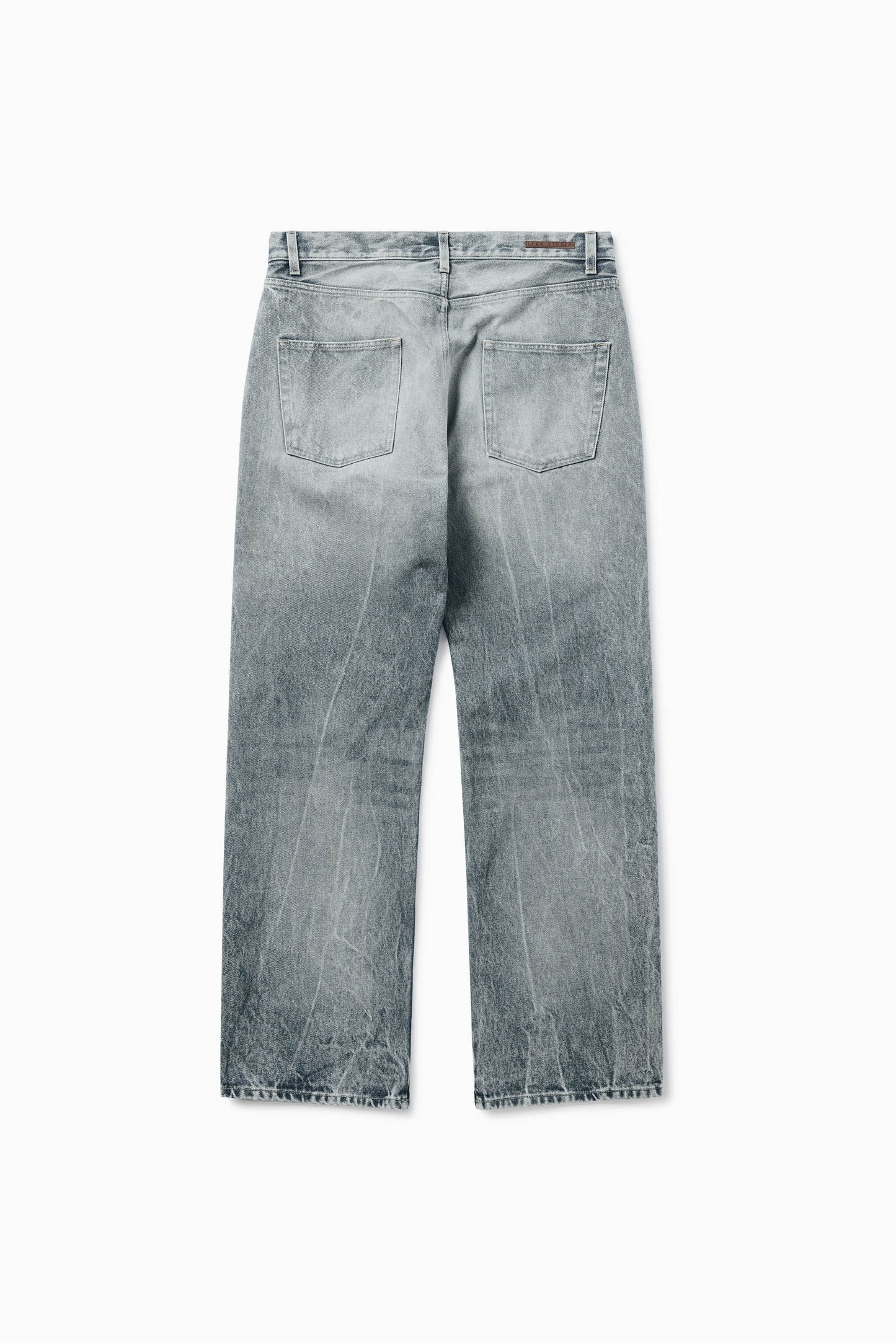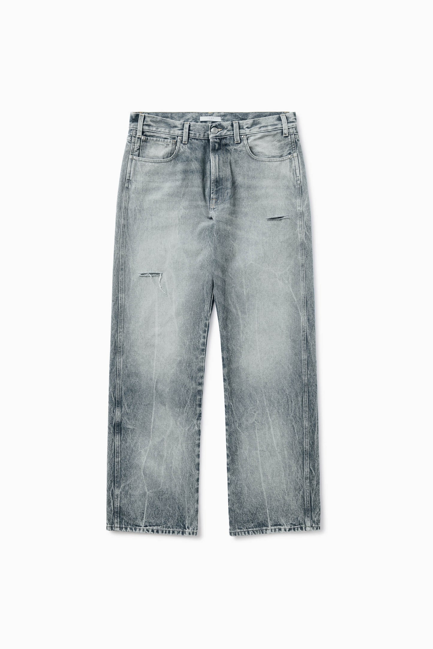 Denim pant featuring washed effect, belt loops, zip and button fastening, five pockets, front distressed detail and logo label on the back.