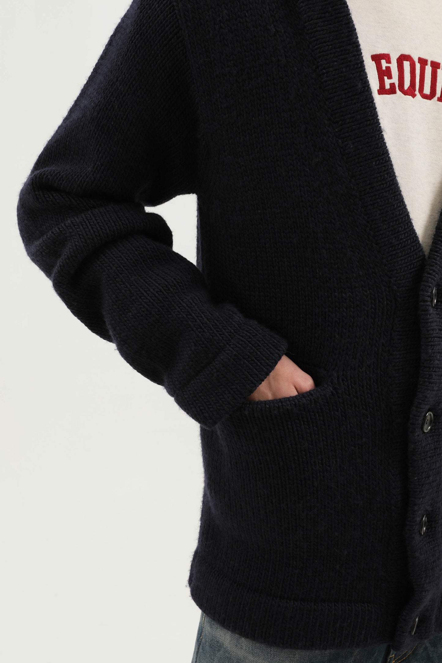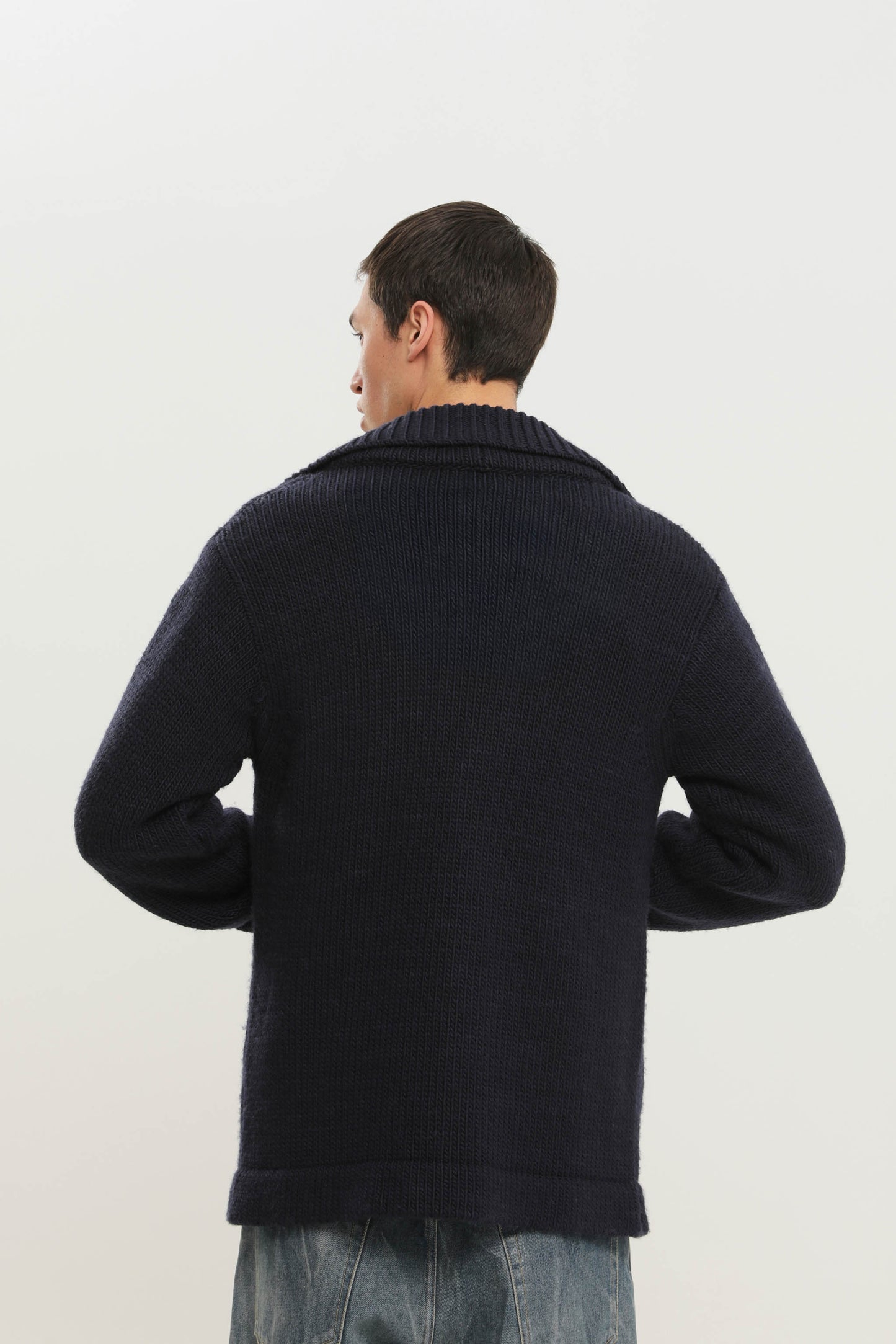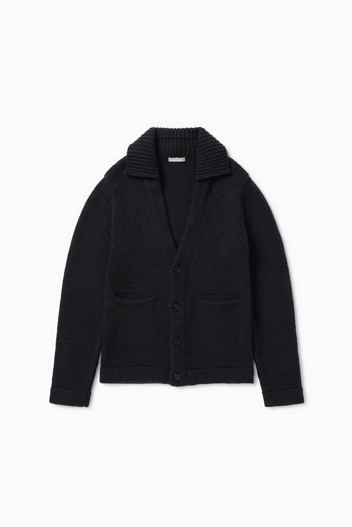 Cardigan sweater featuring ribbed collar, front button closure, long sleeves, front pockets, ribbed cuffs and hem.