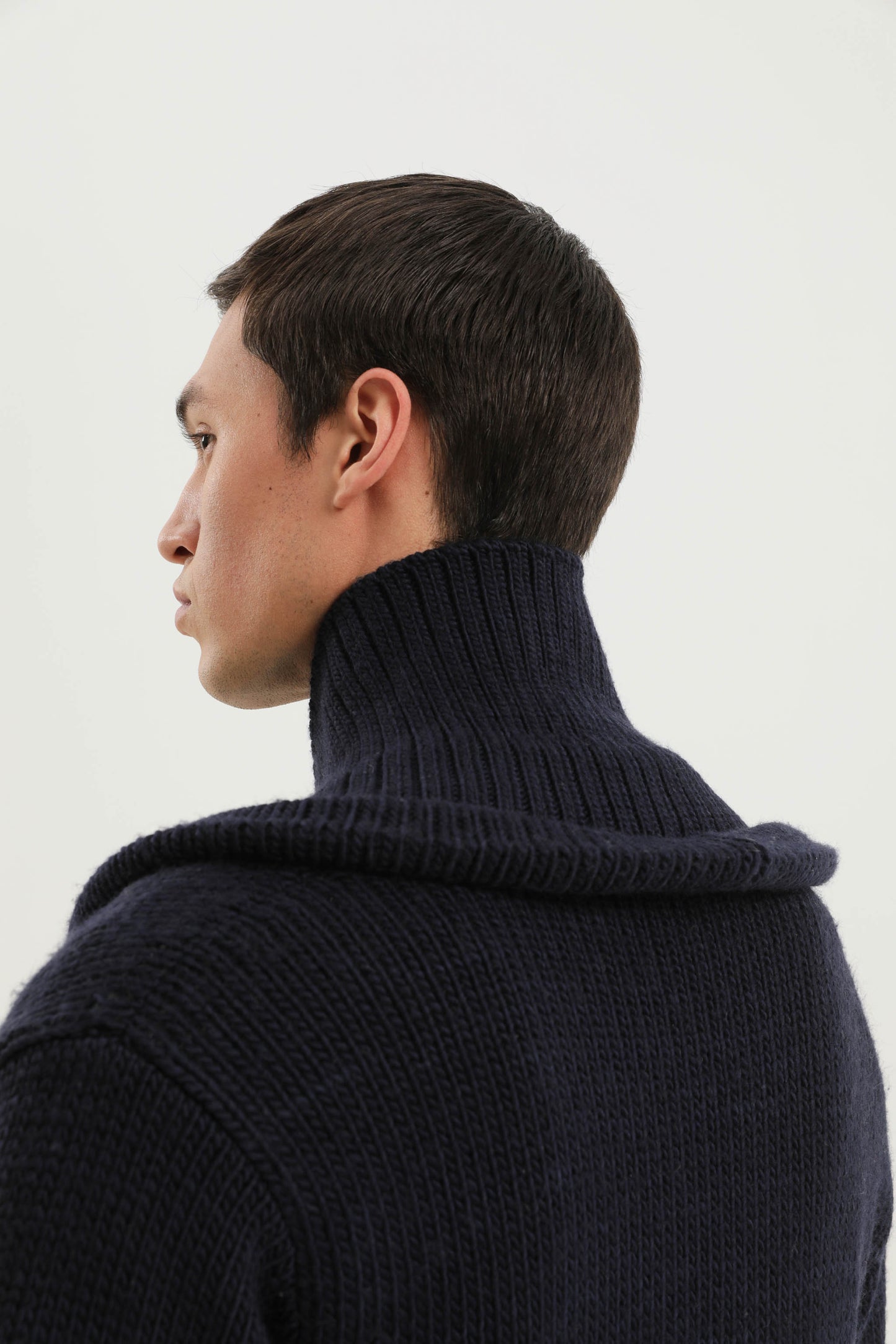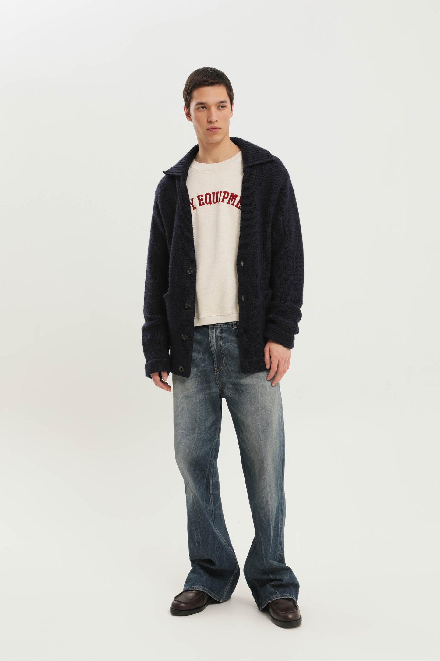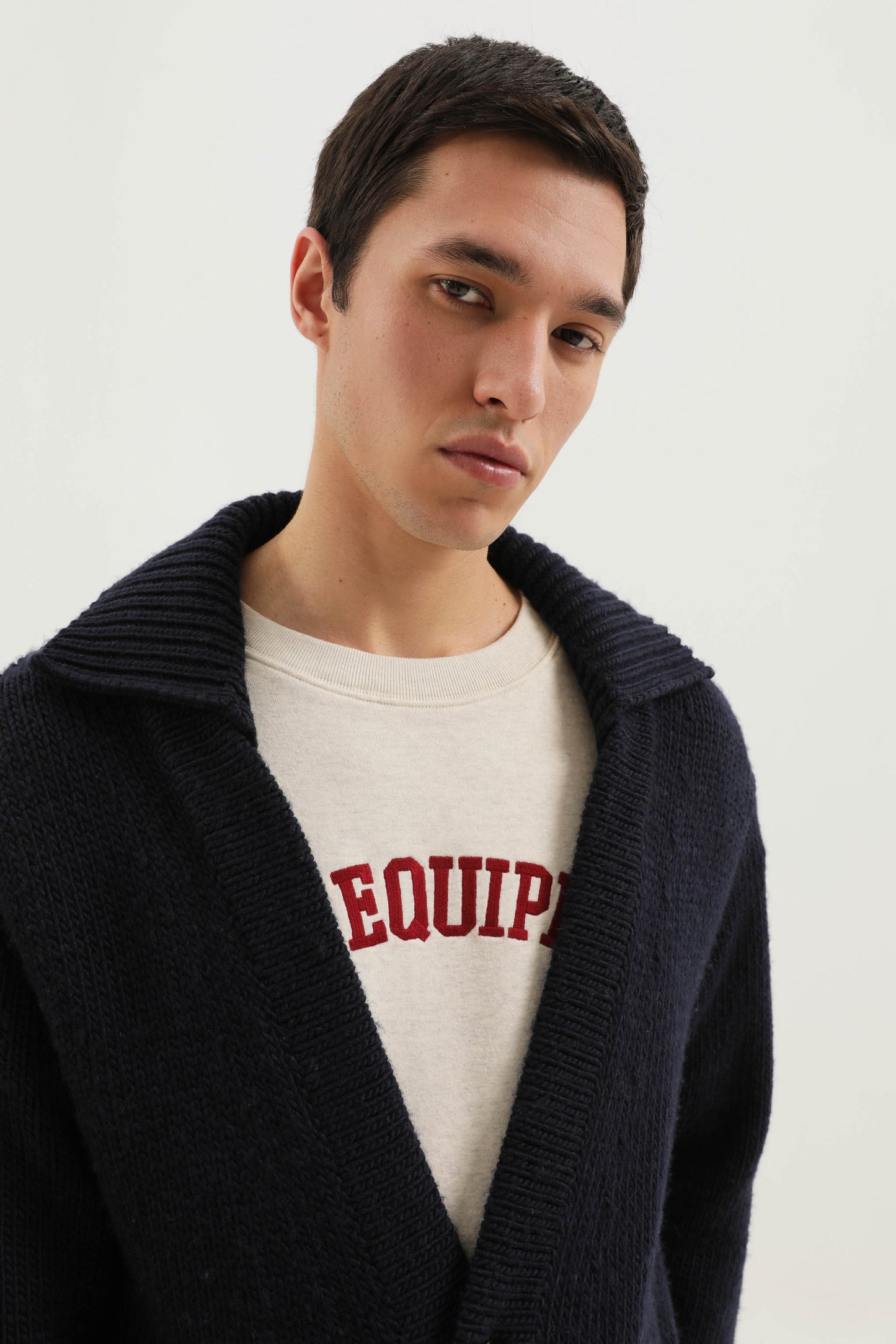 Cardigan sweater featuring ribbed collar, front button closure, long sleeves, front pockets, ribbed cuffs and hem.