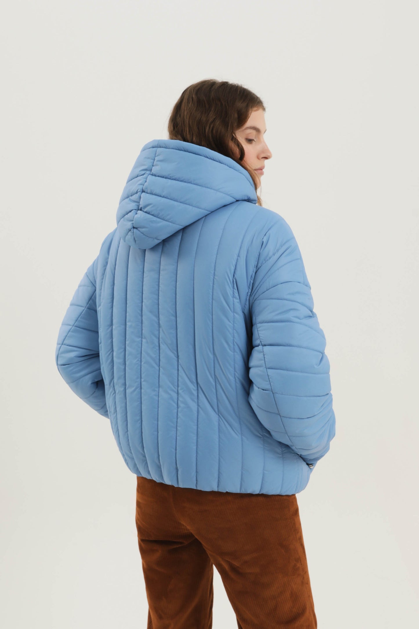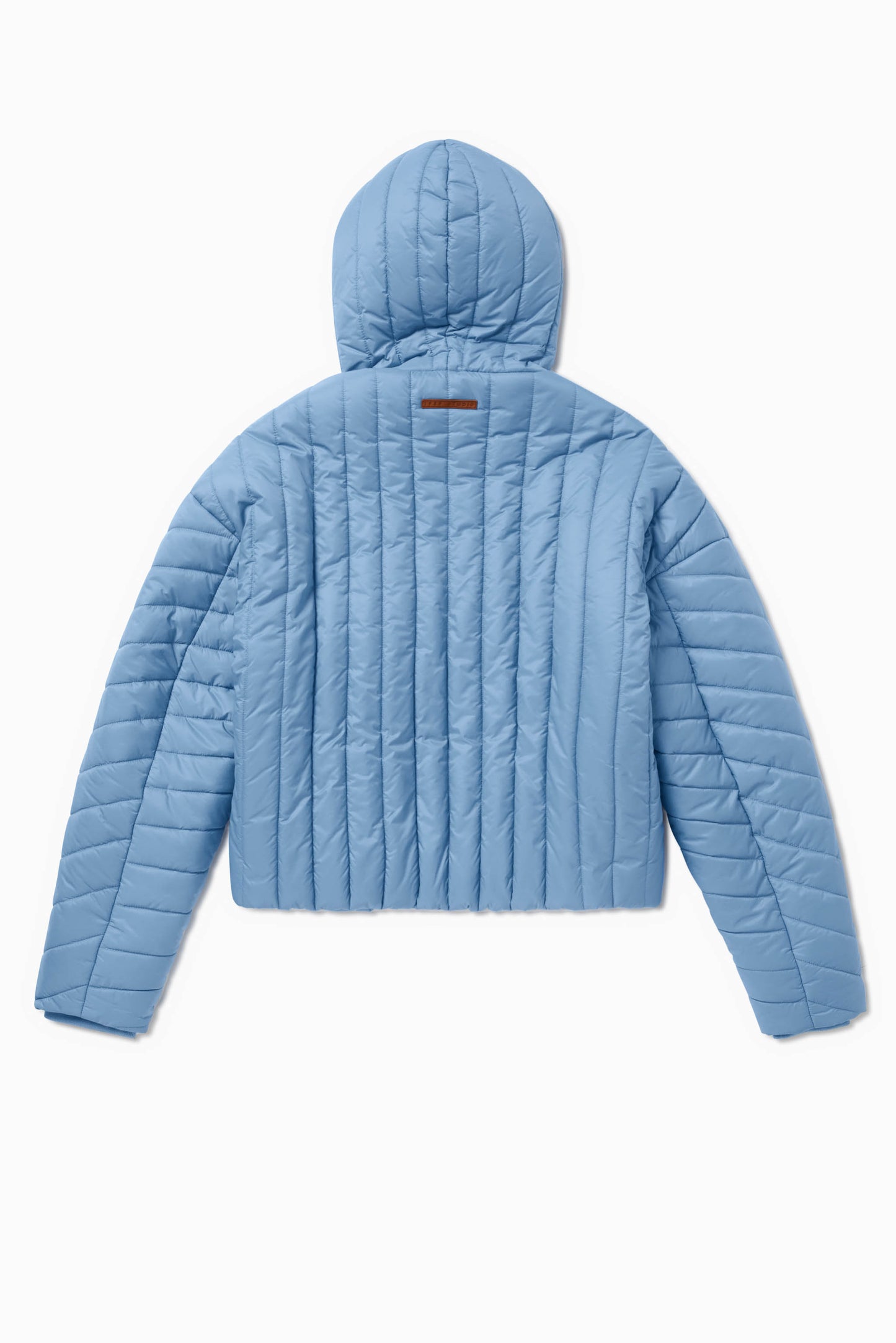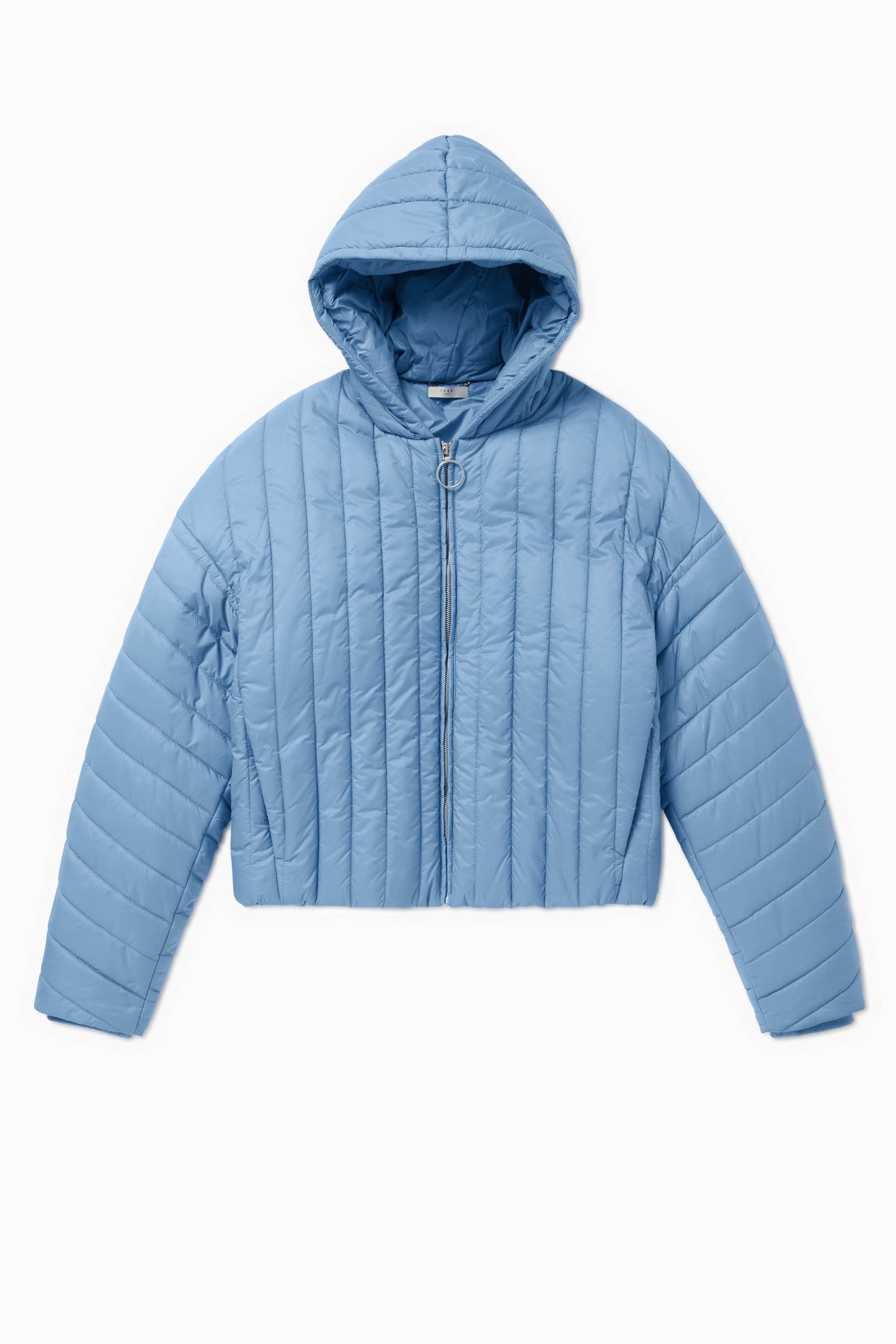 Puffer cropped jacket featuring quilted design, hood, front zip fastening, side zip pockets and logo label on the back.