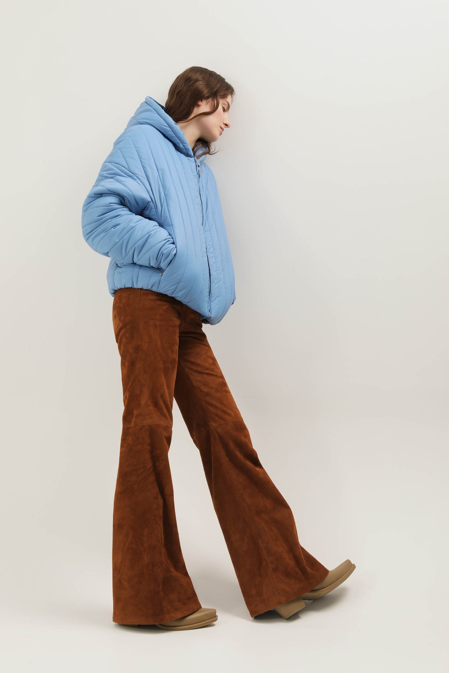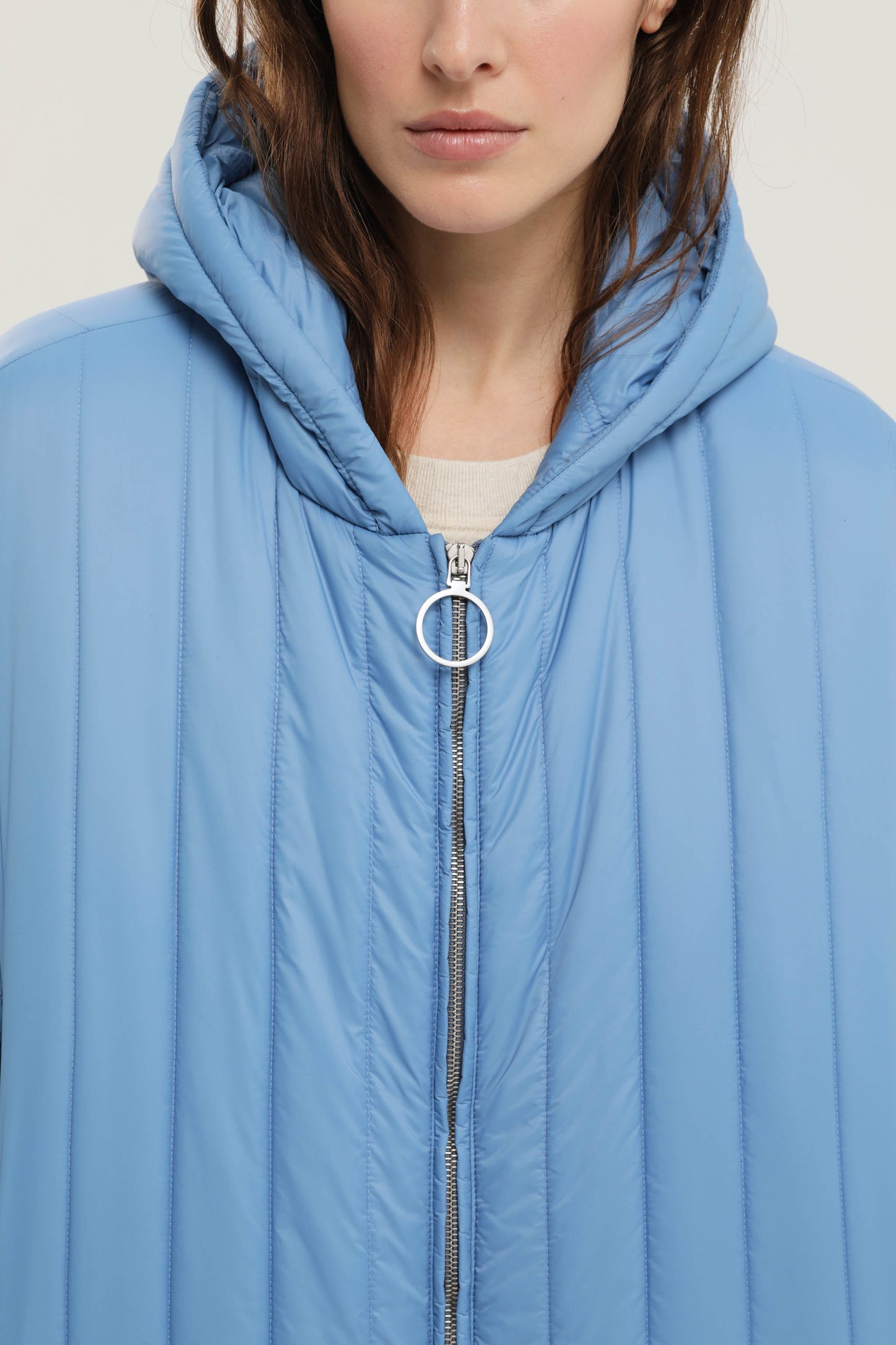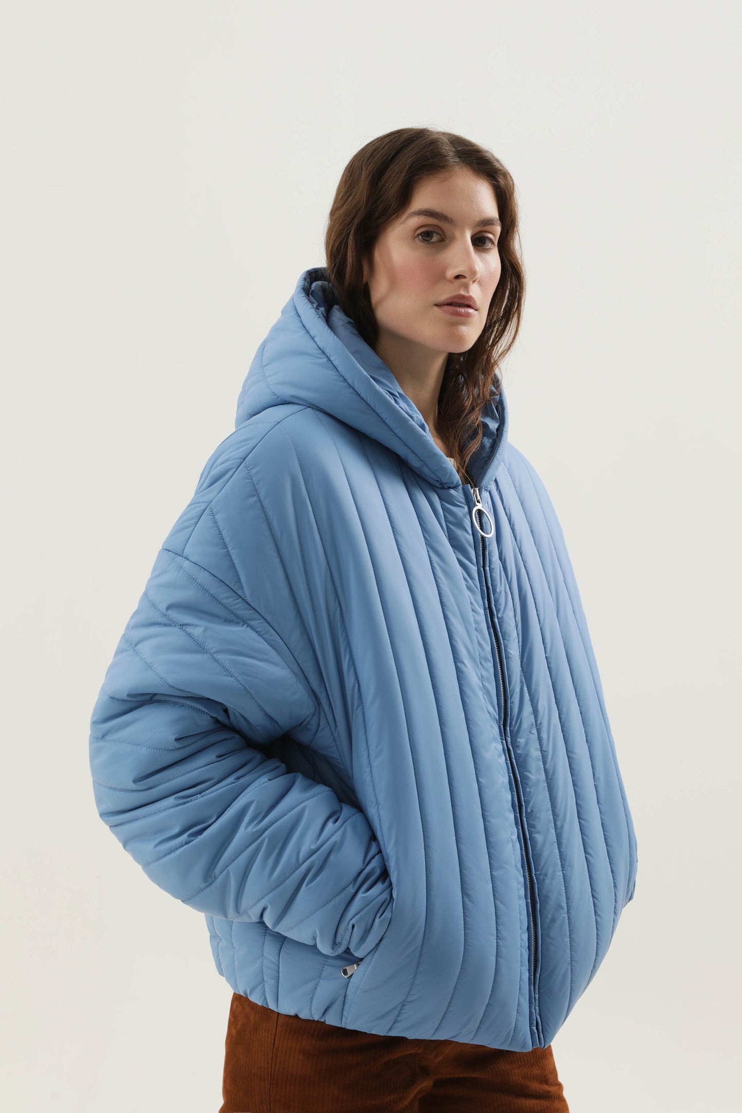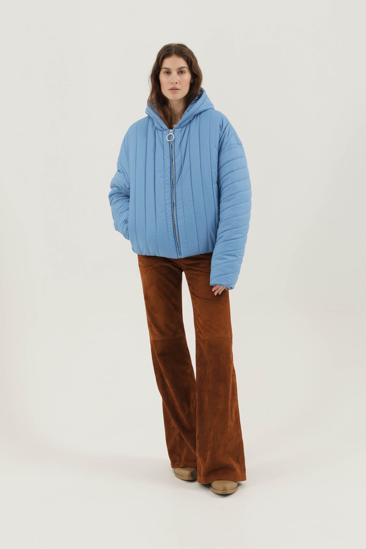 Puffer cropped jacket featuring quilted design, hood, front zip fastening, side zip pockets and logo label on the back.