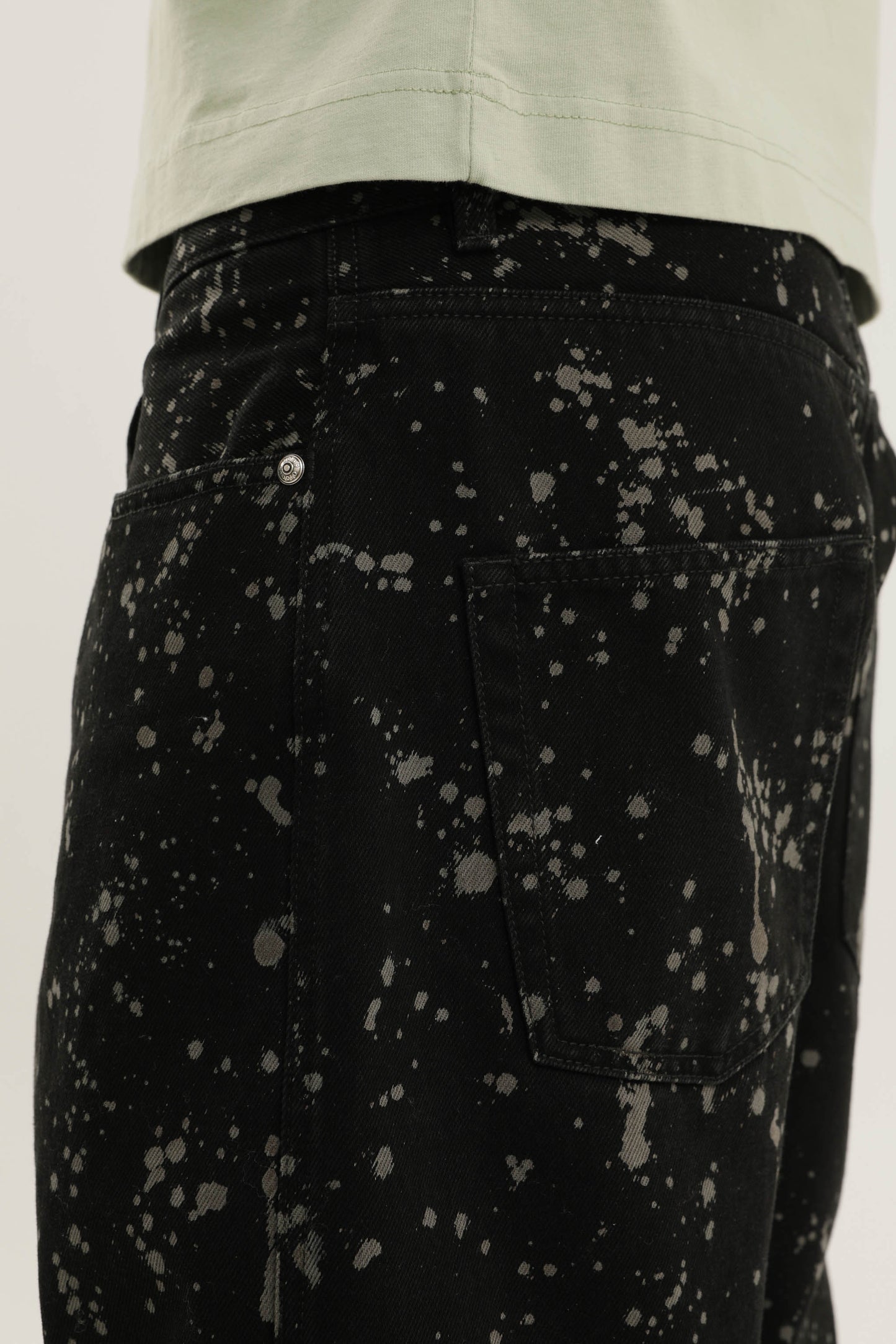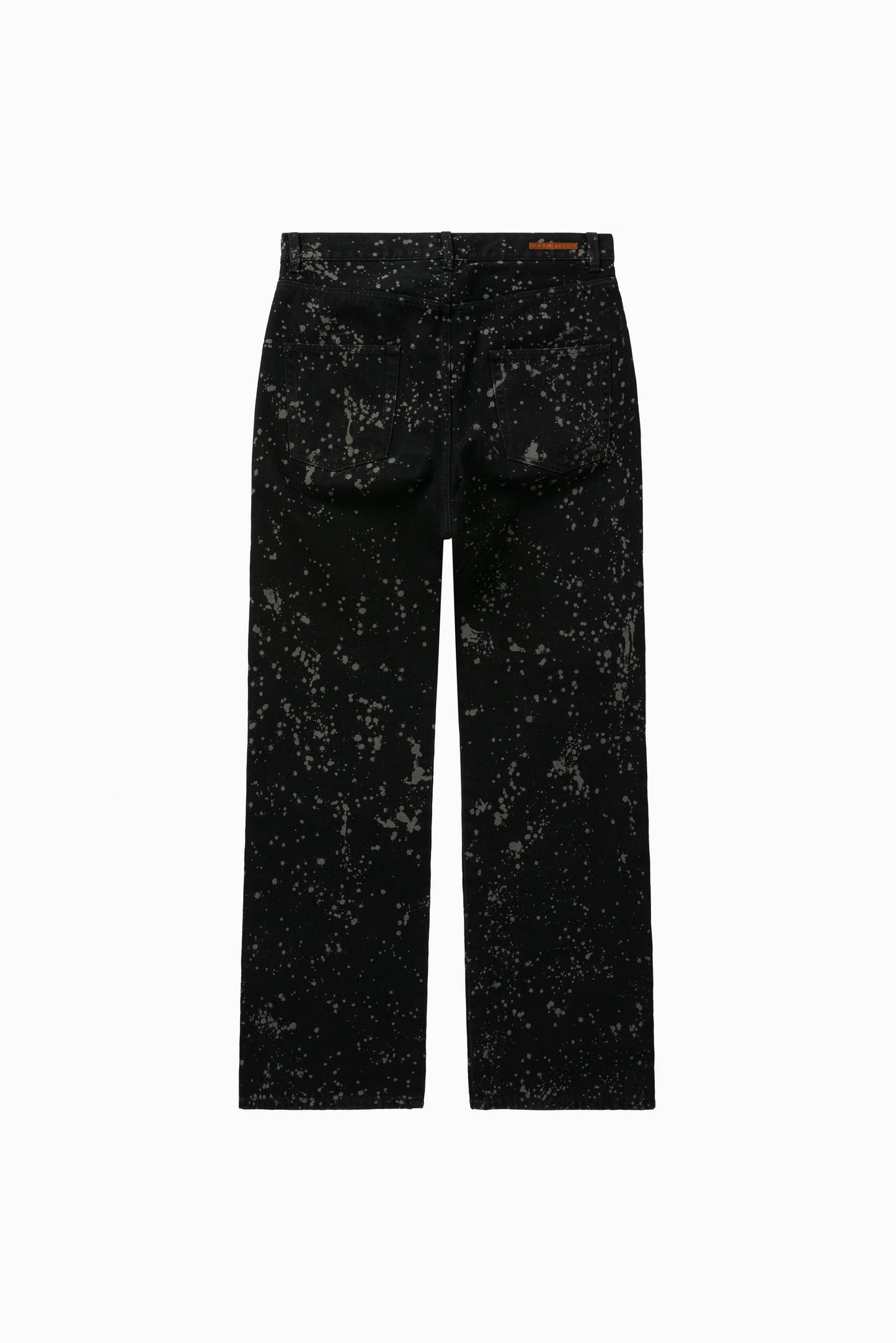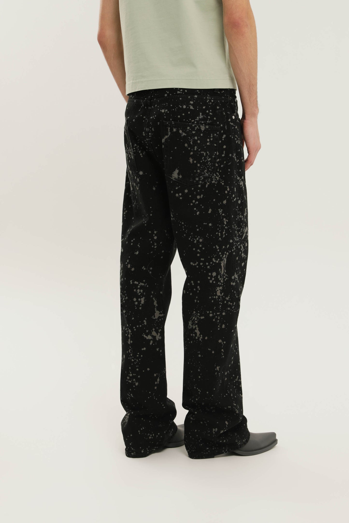 Denim pant featuring paint splatter effect, belt loops, zip and button fastening, five pockets and logo label on the back.