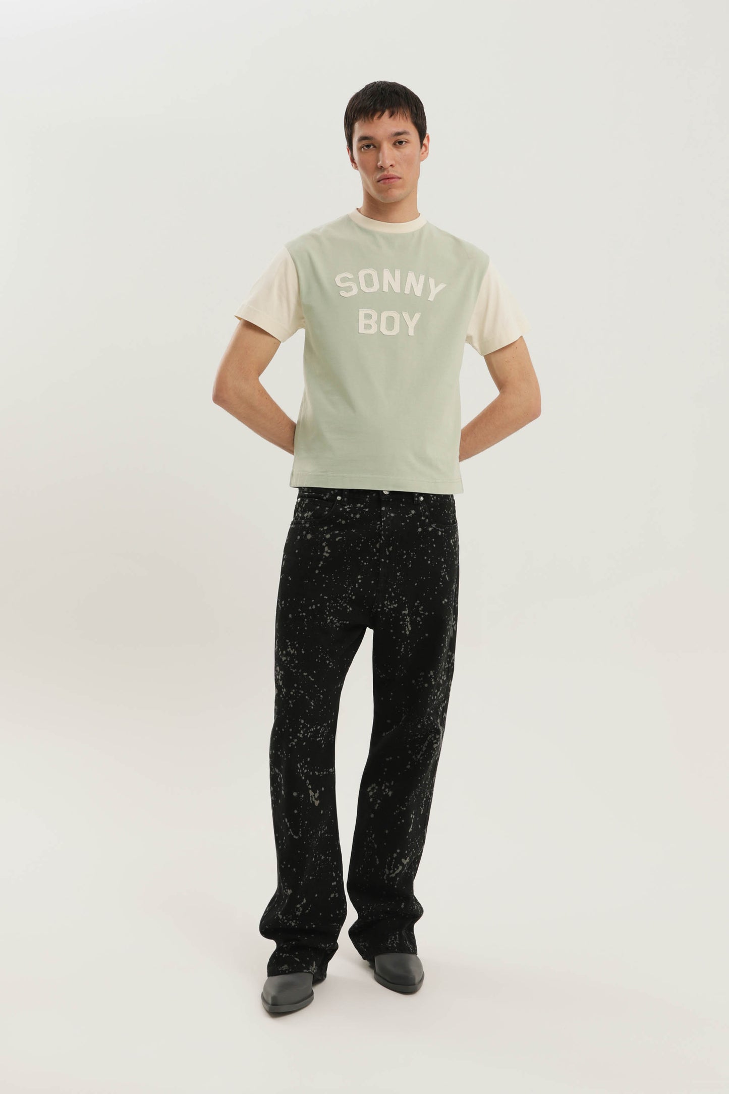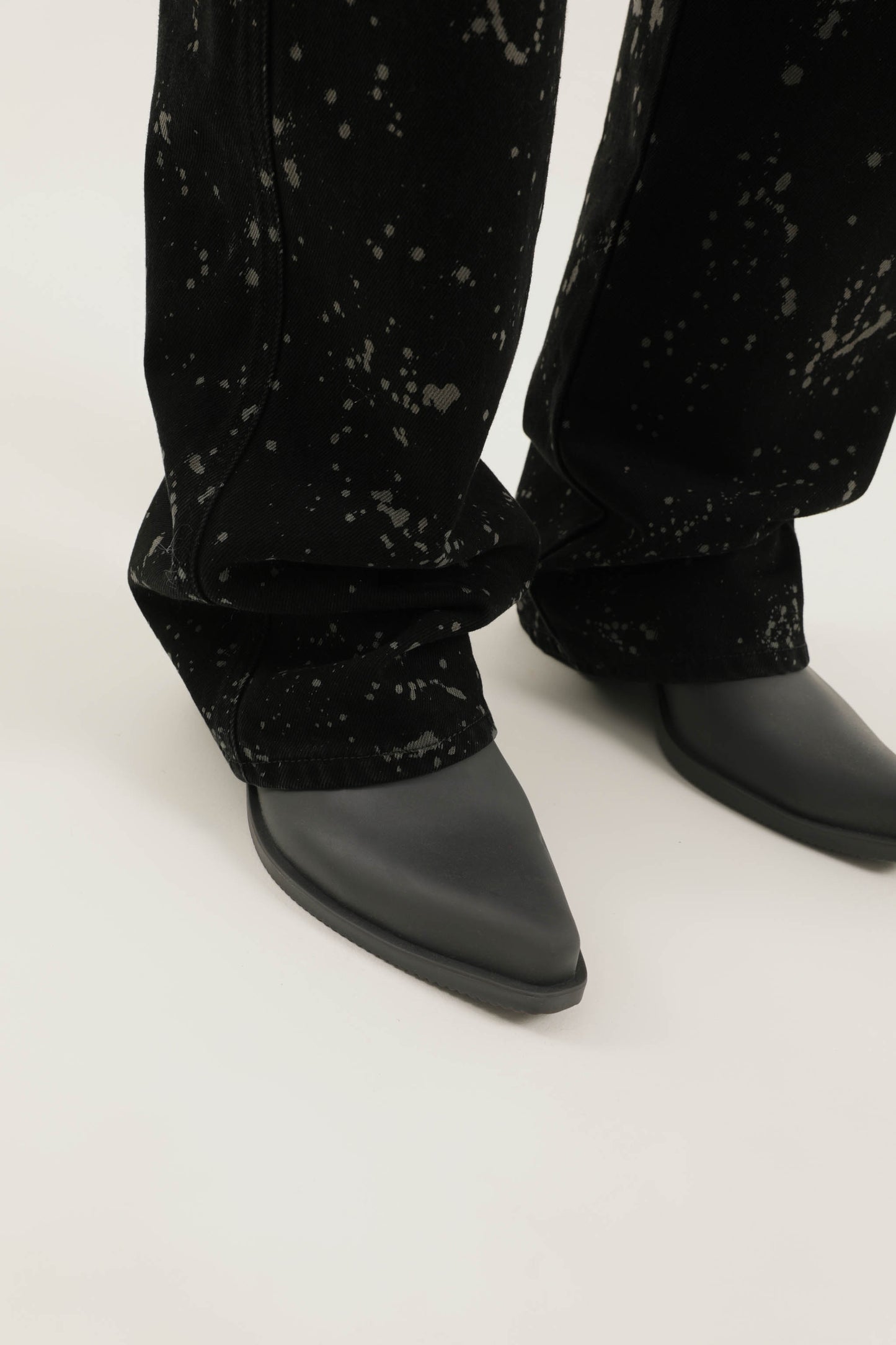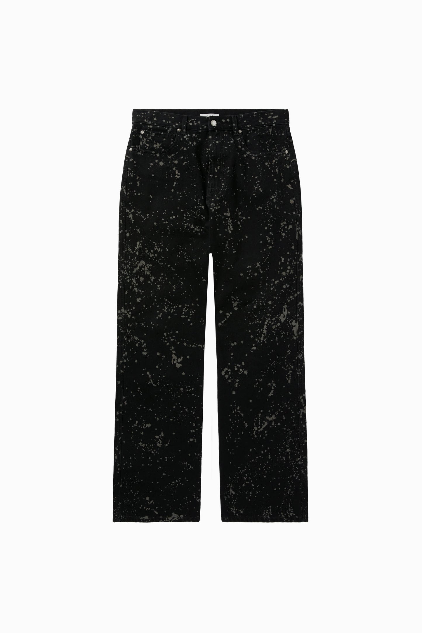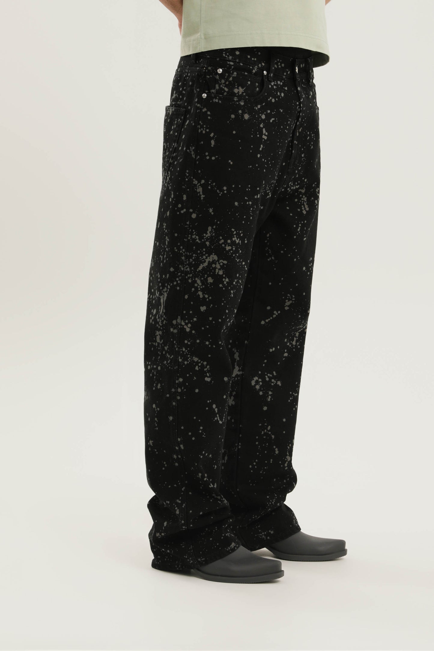 Denim pant featuring paint splatter effect, belt loops, zip and button fastening, five pockets and logo label on the back.