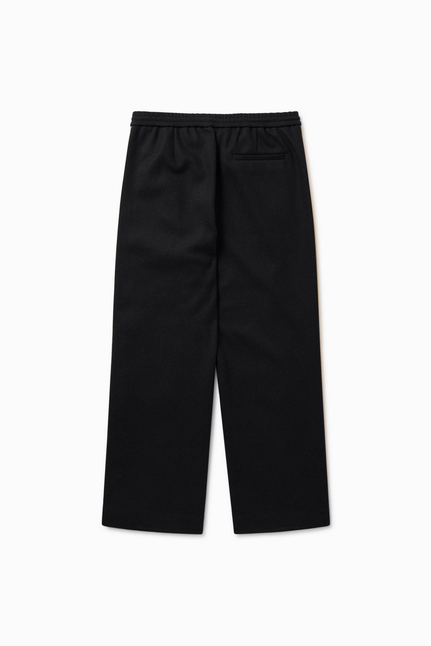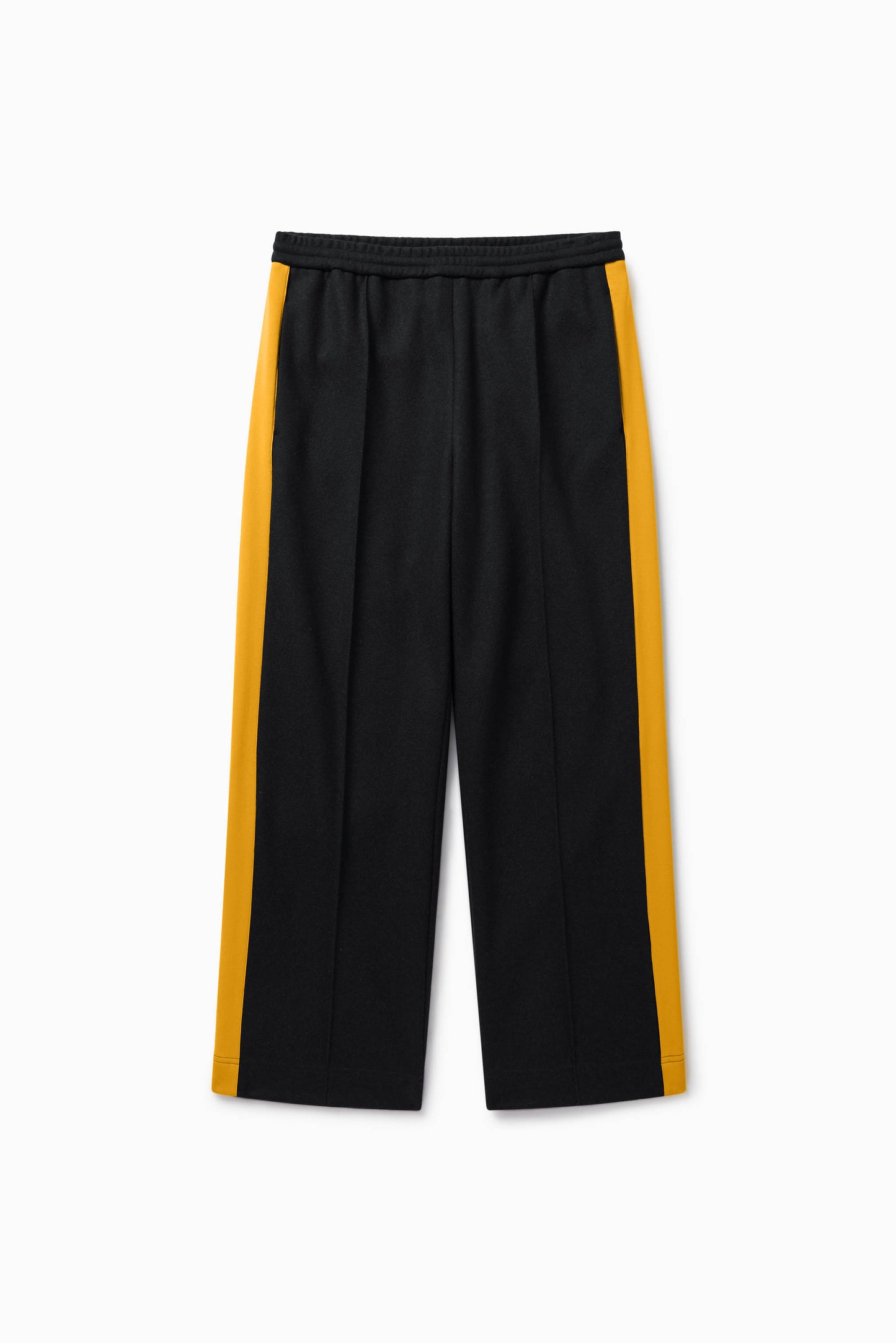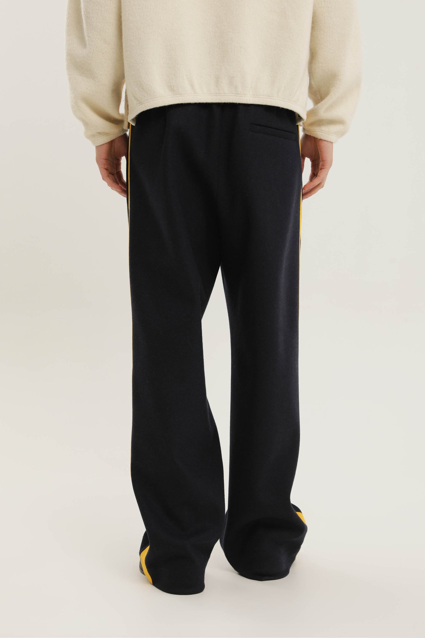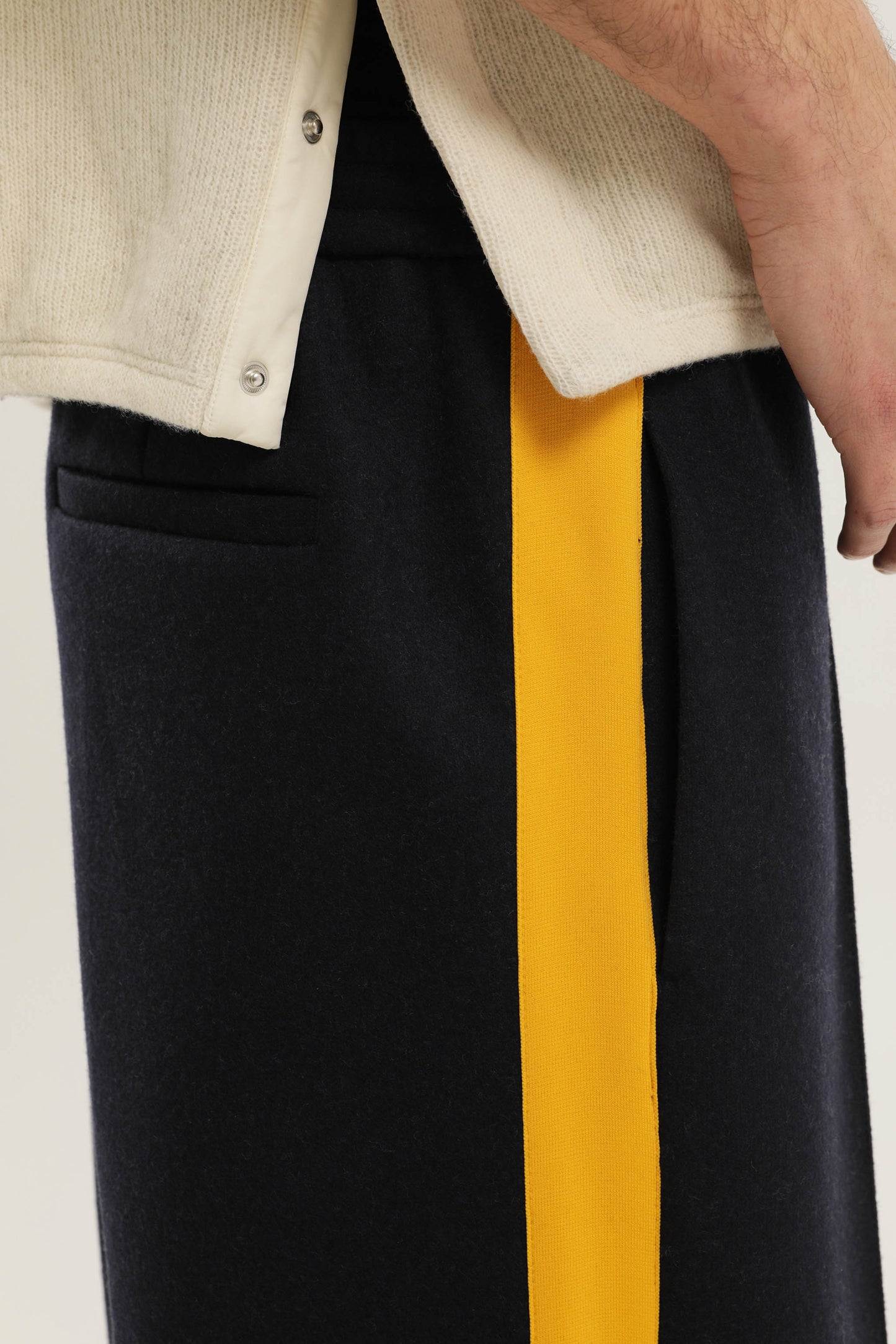 Wool pant featuring elasticated waistband, contrasting bands on the sleeves, side zip pockets, logo label on the back, ribbed neck, cuffs and hem.
